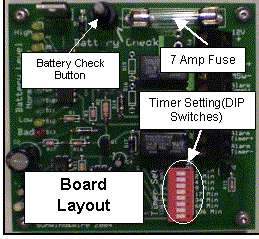 The Shed Alarm Security System can be set to operate from 1 to about 136 minutes Set one of the Timer Setting “DIP Switches" to the desired time setting listed to the right. The alarm will stop around the desired time. A separate Constant Output can be used to power a strobe or other device until someone resets the Alarm or the batteries run out of power |